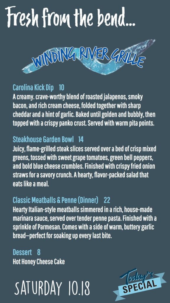 Specials listed below. As a reminder, the regular Winding River Grille Menu is always available.